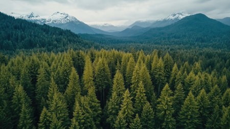 Aerial top view pine forest. Texture of coniferous forest view from above. Green background nature. Picture taken using drone.