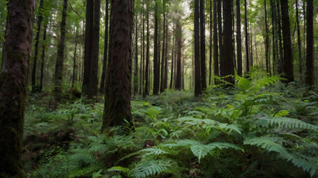 A panoramic wide view of Western red cedar forest growing closely together after rain wet leaves reflecting soft light fresh soil visible ultra realistic photography cinematic wide composition lifelike natural scene