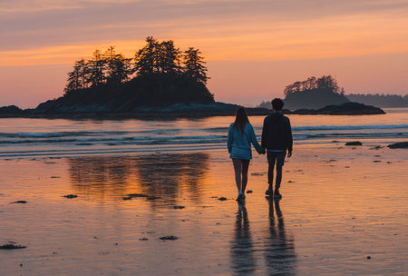 Two people are seen walking on a beach at sunset, holding hands. The scene features warm colors, with the sky displaying orange and pink hues. Silhouettes of small islands are visible in the distance. This image could be used for romantic themes, travel, or general lifestyle content.