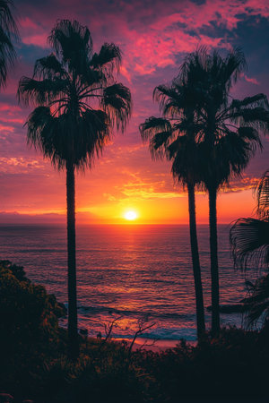 Breathtaking sunset view with silhouetted palm trees against the vibrant orange and pink sky over a calm serene tropical beach A peaceful idyllic scene perfect for travel and vacation concepts