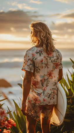 Man with long hair in floral shirt holding surfboard, gazing at ocean from beach