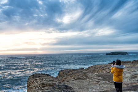 Woman take shoot of seascape under cloudy sky on mobile phone on cliffy shore. Cannon beach Oregon