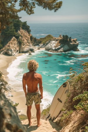 steven stands at the edge of a breathtaking beach, capturing the awe and wonder of exploring new places, with the warm sun shining down and the turquoise ocean waves gently lapping at the shore, evoking feelings of serenity and adventure in this stunning coastal landscape photography. ai generated