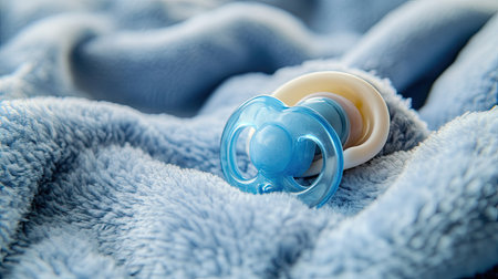 A close-up of a baby pacifier on a soft blanket, with space for text on the blanket or background.