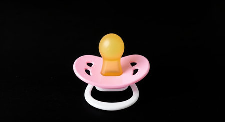 A close-up studio shot of a pink and yellow baby pacifier with a white ring, set against a solid black background.