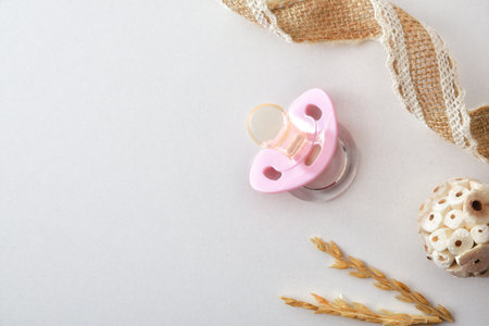 Female baby birth background with pink pacifier and decoration isolated on white background. Top view.