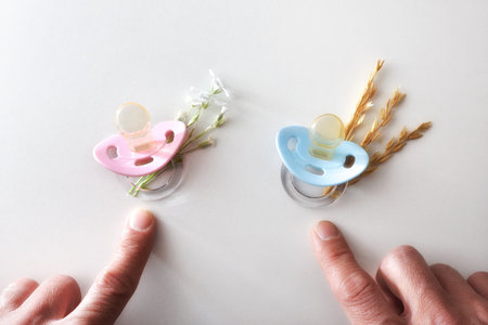 Hands pointing at two blue and pink pacifiers with decoration flowers isolated on white background conceptually deciding the sex of the baby. Top view.