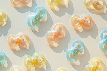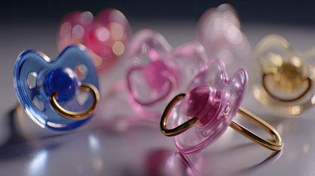 Baby pacifiers, colorful and playful, scattered on a pastel background, creating a cheerful and soothing atmosphere for nursery decor and parenting themes