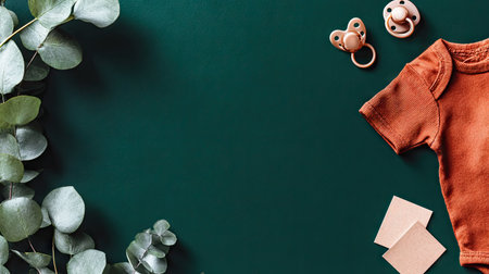 Flat lay composition features a terracotta-colored baby bodysuit, two pacifiers in a rose gold color, and eucalyptus leaves arranged around the central items against a deep teal background. Two small, light beige cards are placed on the bottom right corner.