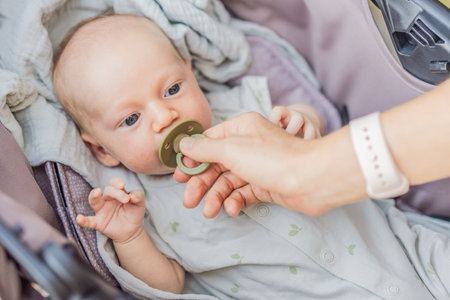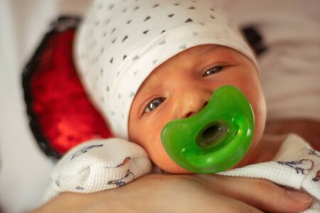 Close-up detail portrait of mother holding cute little peaceful newborn baby in her hands. Beautiful child calm sleeps soundly with pacifier in his mouth