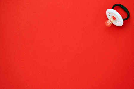 Baby pacifier on a red background with copy space. Rubber pacifier, top view