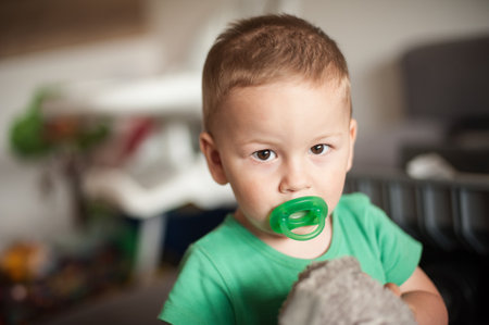 A little boy, wearing a green shirt, gazes at the camera while holding a toy, his green pacifier visible. The indoor atmosphere feels warm and inviting.