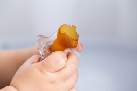 A torn and chewed silicone nipple in the hands of a baby. The concept of problems with bite in children due to the pacifier. Teething. Copy space for text
