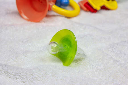 Bright green baby's dummy with child toys on white blanket background.