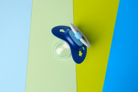 Baby pacifier on color background, top view