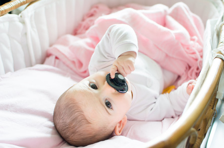 Cute baby sucking a pacifier lying in a playpen