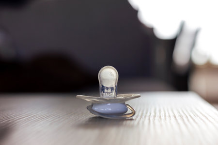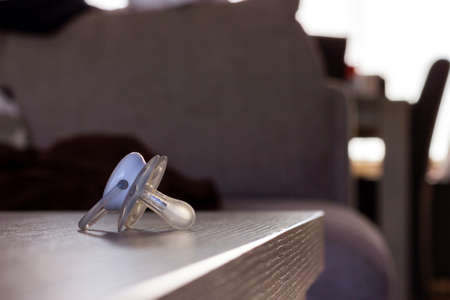 Brecht,Belgium - September 26, 2020: A soother lying on a wooden table indoor in a living room. The pacifier is white and seethrough and is ready to be used by a toddler or baby for comforting.