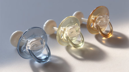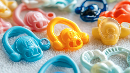 colorful baby pacifiers, playful design, soft shadows, pastel colors, abstract background, baby accessories, minimalistic style, child care items, motherhood concept