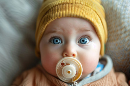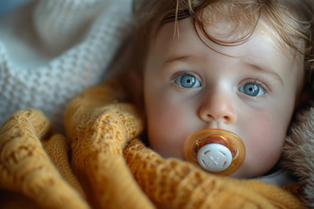 Closeup of a smiling baby with a pacifier and a headband, soft focus, warm and cozy