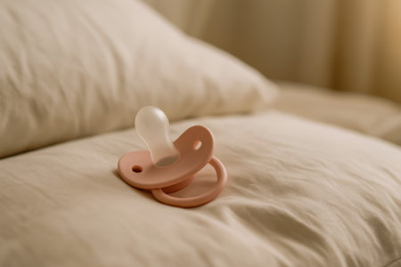 A soft pink baby pacifier placed gently on a cozy, neutral-toned bed