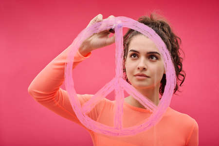 Portrait of young peaceful woman with closed eyes standing in front of pacifism sign on pink background