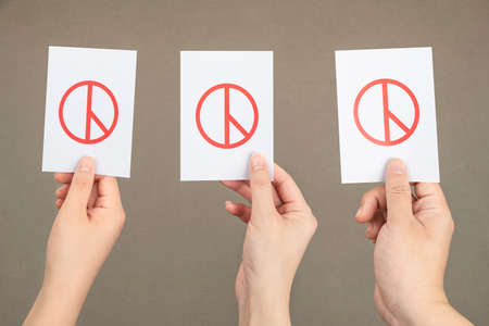 woman holding peace sign on a piece of cardboard pointing it towards the camera shot at shallow depth of field, concept of world peace and ending wars