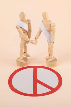 The peace symbol carved in wood with chisels. Peace concept, global solidarity, woodworking