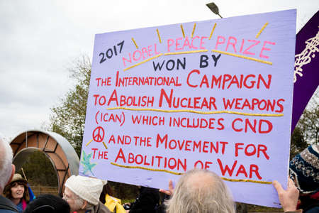 Aldermaston, United Kingdom, 1st April 2018:- CND protesters gather outside the main gate to the AWE where Britain’s nuclear warheads are made, on the 60th anniversary of the first CND march in 1958