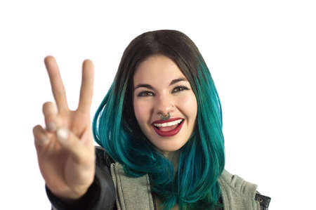 Smiling girl showing the two fingers, counting hand sign on white background. Pierced and turquoise haired.