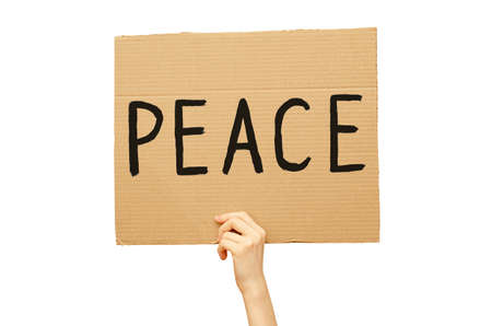 Poster against the war made of cardboard in hand. International day of Peace. Isolated on a white background