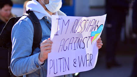 Warsaw, Poland. February 24, 2022. Anti-war protest outside Russian embassy in Warsaw. Demonstrators call for peace and condemn Putin.