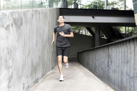 Happy smiling adult Asian woman jogging outdoor in the city park in sunshine beautiful summer day. Happy relaxed mature woman jogging to live an active and healthy lifestyle