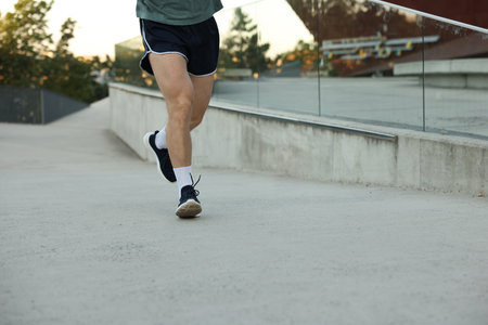 A dynamic image of a runner in gray sneakers captured mid-stride on a brick pathway. Ideal for showcasing fitness, outdoor activity, and energetic lifestyles.