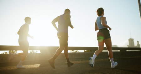 People, running and sun in city for workout, cardio exercise or marathon together on road. Group, friends or runners with lens flare or sprint for physical activity, training or race in an urban town