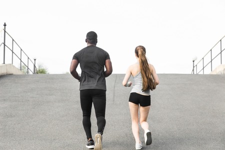 Starting new day from morning jog. Young african couple in sportswear jogging together on the bridge in the early morning
