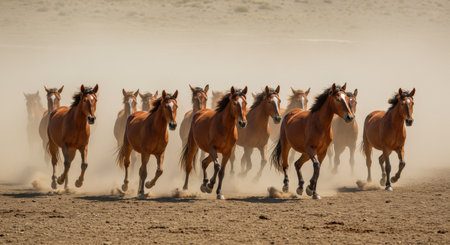 A dynamic scene of majestic horses galloping across a dusty landscape, showcasing their natural beauty and freedom in an expansive wilderness setting.