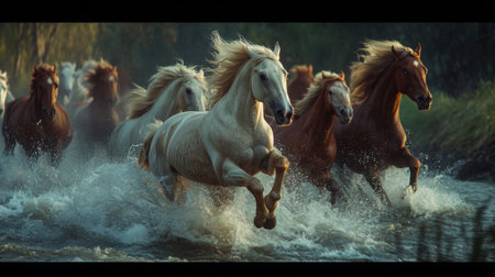 A tidal wave of galloping horses led by Akhal-Teke stallions through a rushing river, side view, blurred background creating cinematic momentum