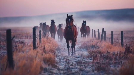 At dawn, a group of horses moves through a foggy field, framed by a barbed wire fence and golden dry grass, creating a serene rural atmosphere.