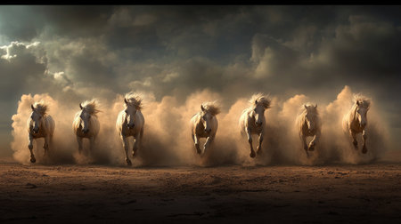 A stunning scene capturing a herd of majestic horses galloping through a dusty landscape, showcasing their beauty and energy. The dramatic clouds and open plains enhance the sense of freedom and wild spirit in nature.
