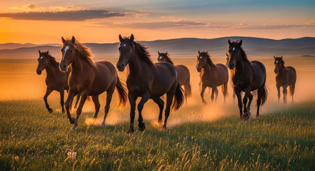 A herd of horses gallops across a grassy field under a vibrant sunset sky. The scene is bathed in golden light, highlighting the horses' dark coats and manes. This image could be used for various commercial purposes, including advertising campaigns or editorial illustrations.