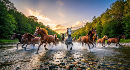 A herd of horses gallops across a field at dawn, creating a dynamic image of freedom. The horses, bathed in warm sunlight, kick up dust. The composition features a low angle with a backdrop of rolling hills. The scene evokes a sense of adventure, suitable for various commercial or editorial uses.