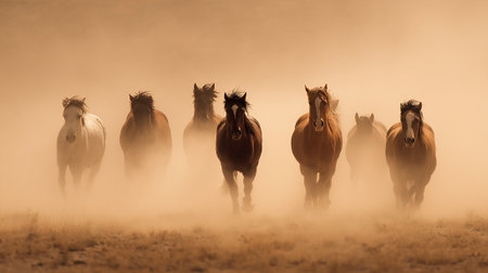 A herd of horses charges through a dusty landscape, creating a dynamic visual effect. The image features a warm color palette with browns and tans dominating. The composition emphasizes movement and action with a wide-angle perspective and natural lighting, suitable for various editorial and commercial applications.