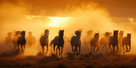 A herd of horses charges forward in a dynamic composition. Warm hues of sunlight filter through the dust, highlighting the animals' muscular forms and manes. This image showcases a natural environment with a sense of movement. Ideal for commercial applications related to wildlife and nature.