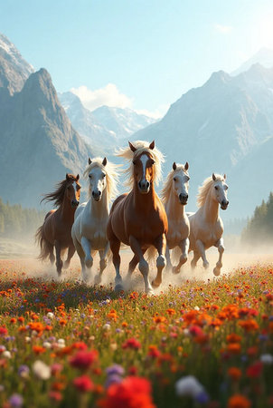 This beautiful photograph captures a group of horses running wild in a natural setting. With their manes and tails flying in the wind, these majestic creatures exude power and freedom. The colors of the landscape and sky provide a stunning backdrop to the action-packed scene. Perfect for any horse lover or nature enthusiast, Ai Gennerated