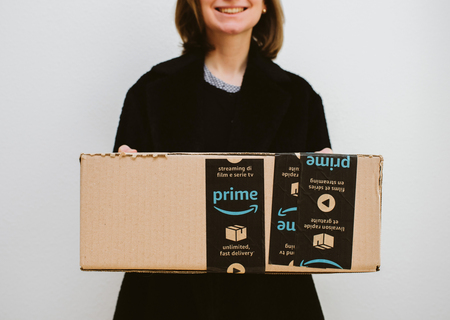 PARIS, FRANCE - FEB 16, 2018: Smiling elegant fashionista woman holding Amazon Prime cardboard parcel box against white background