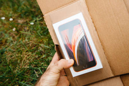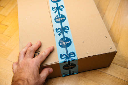 Paris, France - Nov 16, 2018: POV point of view personal perspective male hand holding the new Amazon Prime cardboard parcel with holiday delivery scotch protection band - preparing to unbox unpack