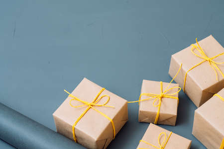 presents wrapping and packaging. holiday traditions and handcraft. gift boxes in craft paper and tied with yellow twine on blue background.