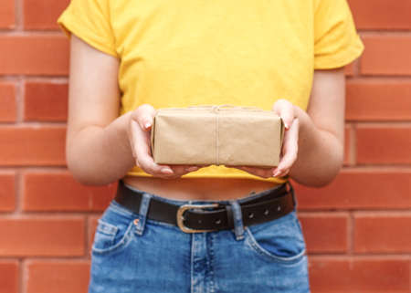young woman wearing yellow shirt, holding gift against brick wall