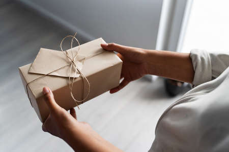 Top view on hands of unknown caucasian woman holding wrapped gift box birthday present
