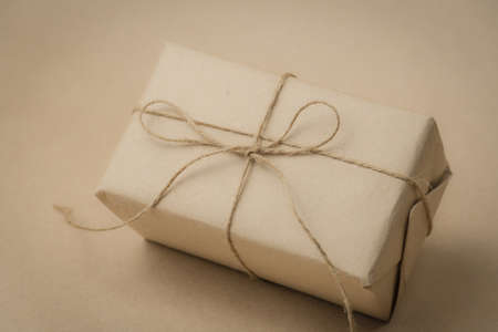 The gift is wrapped in yellowed paper and tied with burlap rope on a beige background. Retro photography.